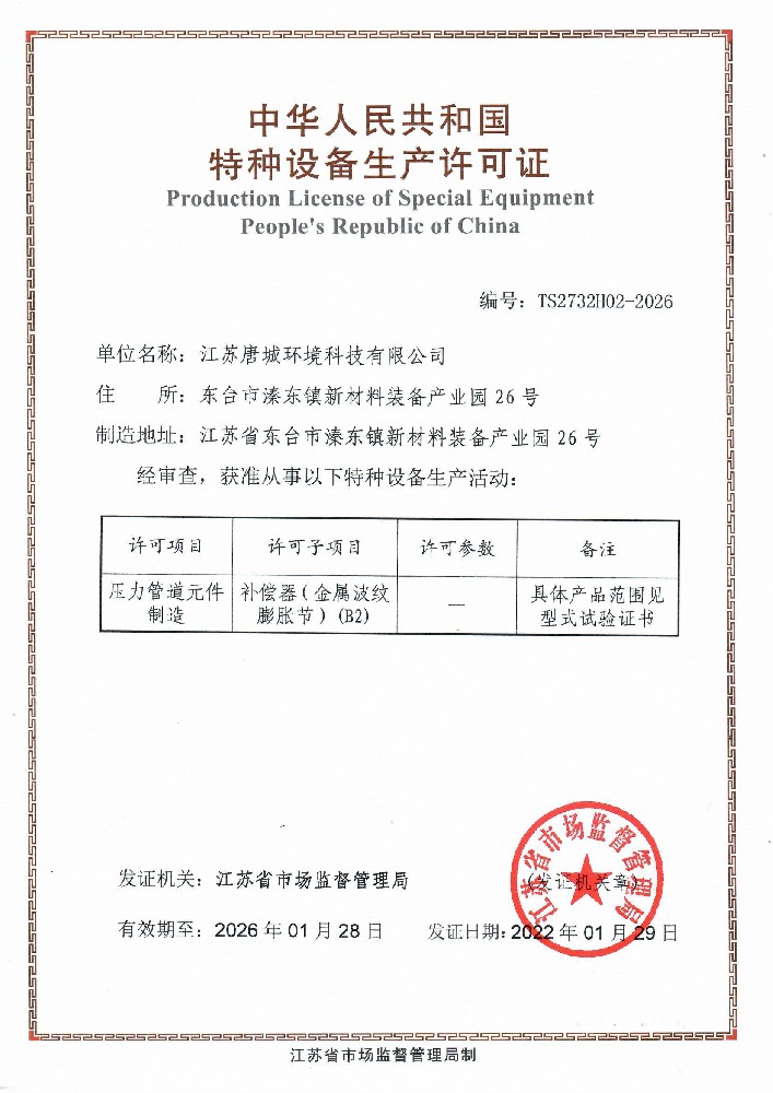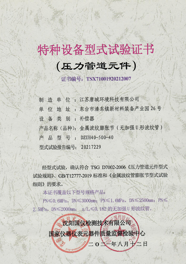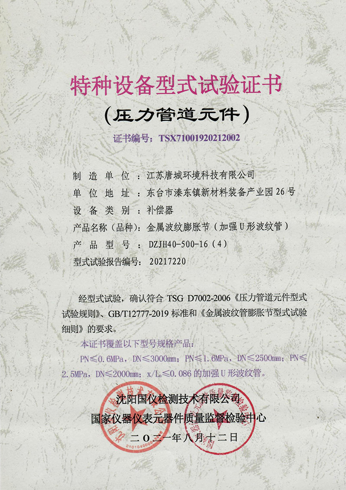 特種設備型式試驗證書-金屬波紋膨脹節(加強U形波紋管)
